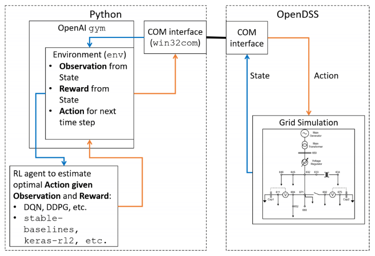 Abstract—This paper introduces a Python framework built upon open-source software for electric grids (OpenDSS) and deep learning (Open AI) for the study of further applications of reinforcement learning on distribution grid networks. This paper describes the framework and applies it to a 13-bus, grid-tied microgrid system, training and using a reinforcement learning agent to optimally control capacitor banks to maintain system voltage under changing loads. The performance of the agent is then compared to known optimal control, as well as to the performance of a capacitor controller built-in to OpenDSS, and a supervised learning-trained neural network.